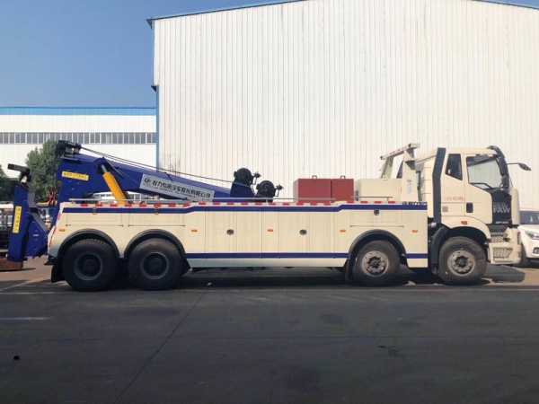 解放国六20-25吨拖吊联体清障车,锡柴425马力发动机CA6DM2-42E6,一汽12档变速箱,轴距1950+4700+1350,前后桥9/16T,12.00钢丝胎,J6P平顶排半驾驶室。