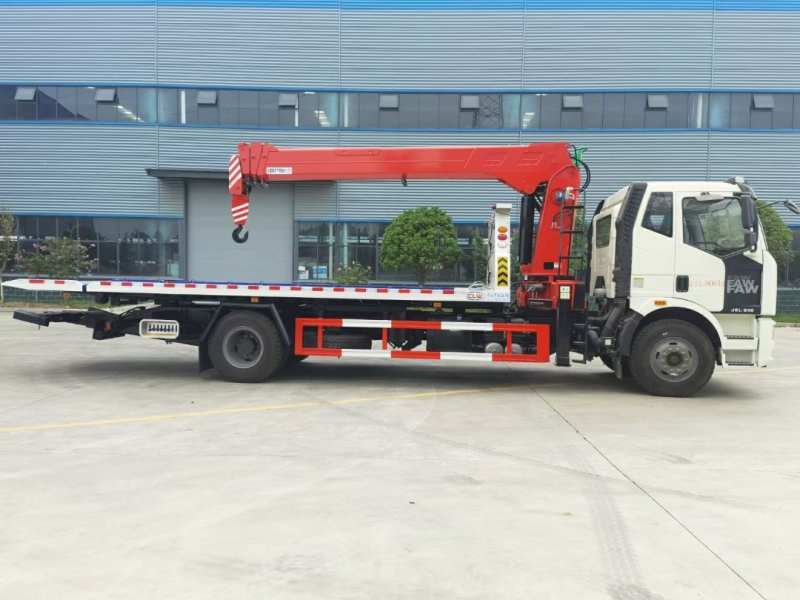 解放一拖二带吊清障车_多功能清障车底盘采用一汽长春解放J6L,底盘型号:CA1180P62K1L2E6Z,国六排放,2017款J6L半浮平顶小排半白色驾驶室,大柴240马力(发动机型号:CA6DH1-24E6),8档变速箱(变速箱型号:CA8TAX090M法兰输出取力器),轴距5800,自动空调,电动升降玻璃,电动后视镜,驾驶员座椅为空气减震座椅,435冲焊桥,后桥速比4.875,10.00R20钢丝胎,单DIN北斗兼容车载系统,标配巡航开关,大梁255*83*(8+7+4),电动液压举升装置,200L钢油箱。整车型号:CL5182TQZC6ZQ,整车长度:10700×2550×3730,总质量:18000Kg,整备质量:14200Kg。