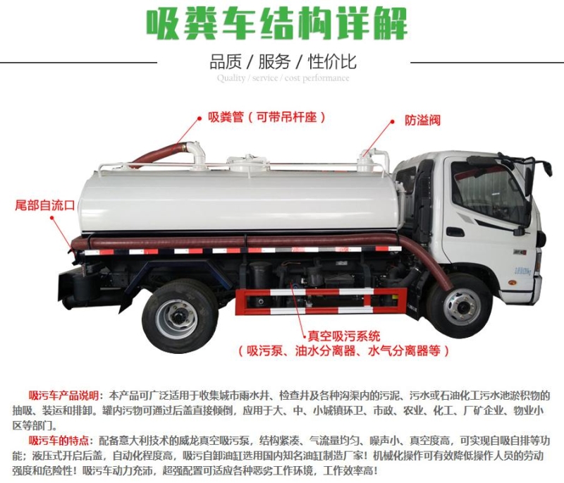 吸粪车主要应用到化粪池,污水沟和下水道等环境下清理清洁工作的专用车辆,与洒水车,垃圾车,并称为三大环卫车型。长期以来受到国家相关扶持政策的帮助和关怀,该类车辆不需交纳购置税。抽满污(粪)罐体时间:≤5min,吸程:≥10m。自吸自排,寿命长,工作速度快,运输方便。吸粪车的排放方式有吊杆加压排放和自流排放两种方式,吸粪车自吸自排,适宜于大、中、小城镇环卫、市政部门使用。